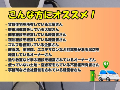 自社の社用車、来られたお客様さま、充電したい人など、あらゆる電気自動車オーナーに使ってもらえます。お客様サービスと差別化・ファンになってもらう事に繋がります