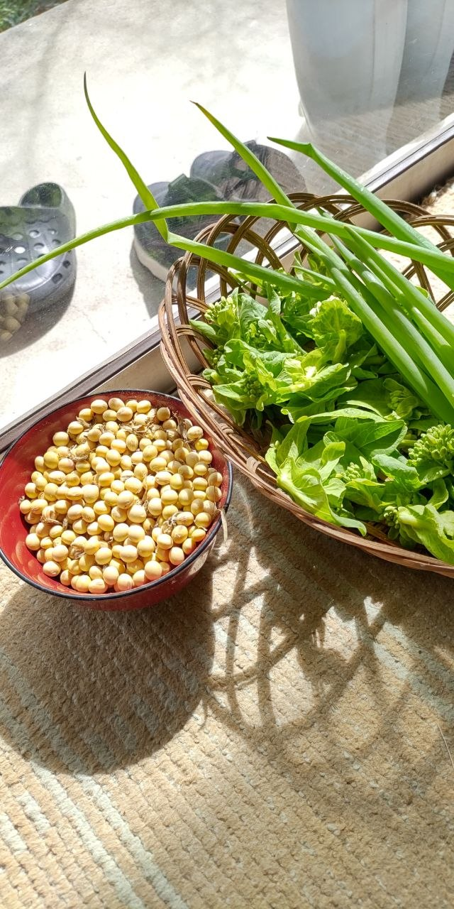 昨年収穫した大豆を煮てほぼ毎日食べています。となりはネギと、トウダチした山東菜の芽。アブラナ科の芽は春の味覚、ちょっと苦くて美味しいです。