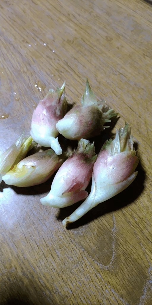 そう、雨が少なく高温のせいで今年は茗荷の出来が不発でした。やっと出てきました。