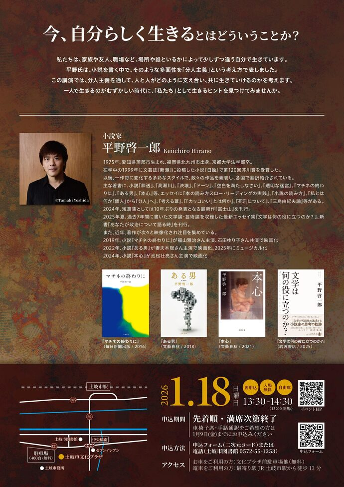 土岐市図書館が、「本の中の知によって豊かに生きる」をテーマに、芥川賞作家・平野啓一郎さんの講演会を開催します。