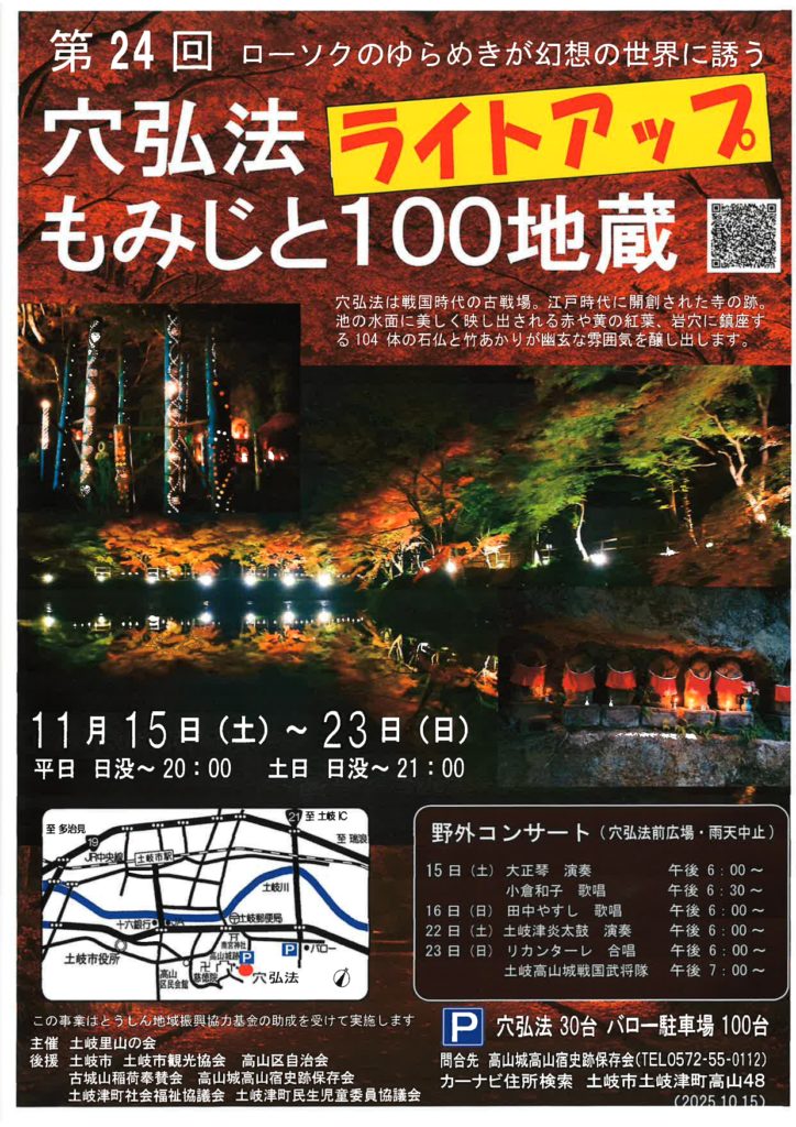 また、期間中は穴弘法前広場で野外コンサートも予定されており、大正琴の演奏や歌唱、土岐津炎太鼓の演奏など多彩な催しが楽しめます。土岐高山城戦国武将隊のパフォーマンスも見どころです。駐車場は穴弘法に30台、バロー駐車場に100台分ありますので車でのアクセスも便利です。問い合わせは高山城高山宿史跡保存会(TEL 0572-55-0112)までどうぞ。