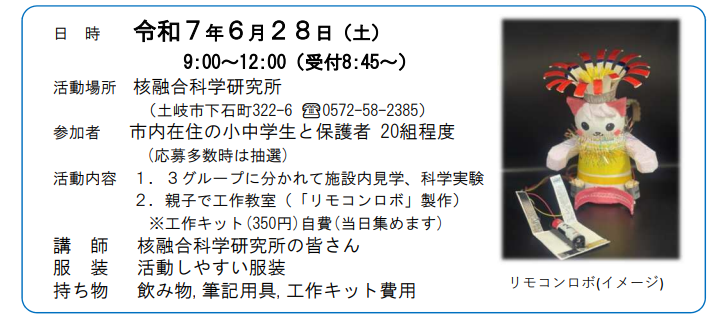 土岐市の子どもたちに、ふるさと土岐の伝統・文化・自然・産業を体験的に学ぶ機会を提供する「土岐ふるさと塾」。今回は第14回目として、最先端科学技術の研究開発現場である「核融合科学研究所」を舞台に開催されます。
