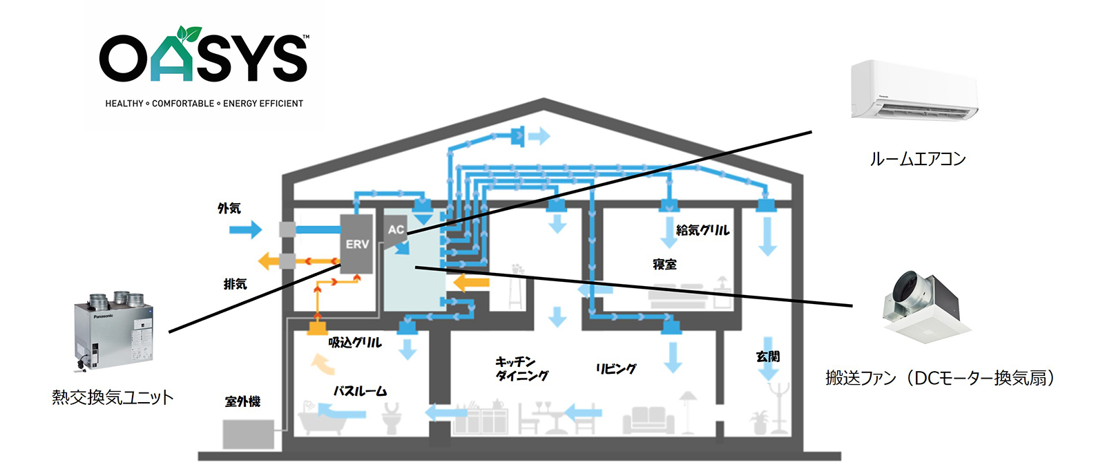 個人住宅向けの最新の全館空調システムとして、パナソニックが2025年1月に米国市場向けに発表した「OASYS」が注目されています。このシステムは以下の特徴を持っています: