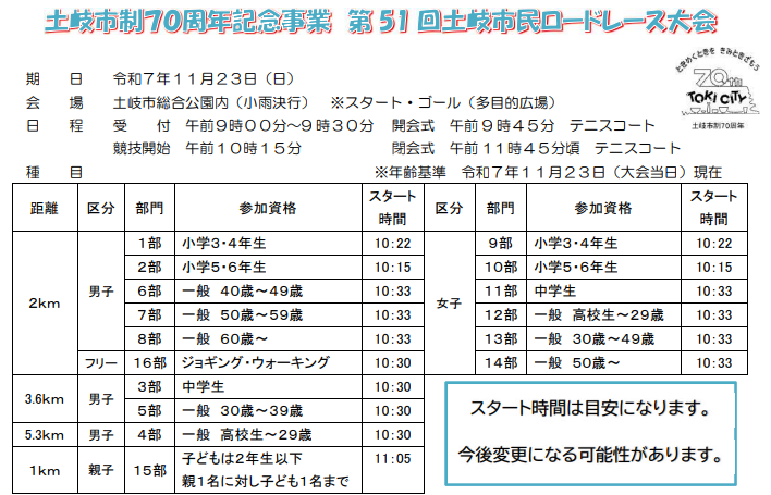 - 種目:2キロ、3.6キロ、5.3キロ、親子1キロなど